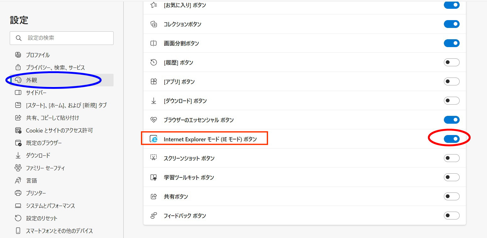 - 右の一覧をスクロールして Internet Explorerモード(IEモード)をオンにして下さい