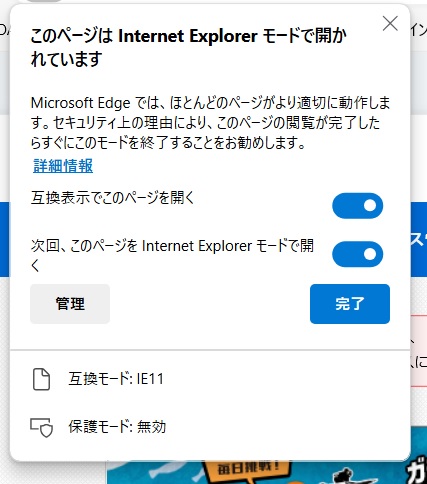 - Internet Explorer の互換性」の「Internet Explorerモード(IEモード)で